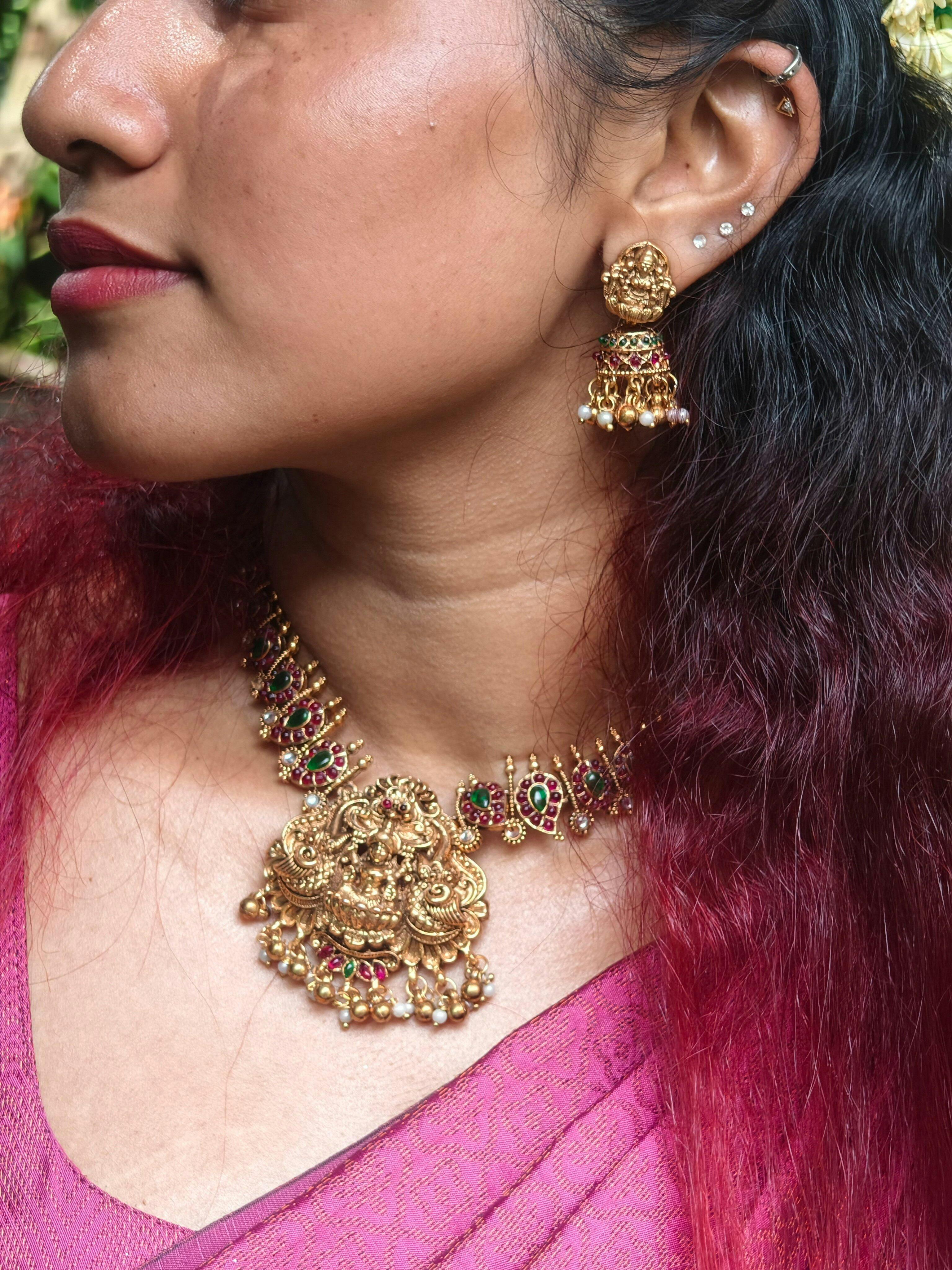 A majestic piece rooted in temple tradition — this antique-finish Lakshmi haaram features rich ruby and emerald kemp stones arranged in delicate paisley motifs along the chain. The grand pendant showcases Goddess Lakshmi seated on a lotus, flanked by twin peacocks, and adorned with gold bead hangings and pearls. Paired with intricately designed jhumkas, this set exudes divine elegance — perfect for bridal wear or festive occasions