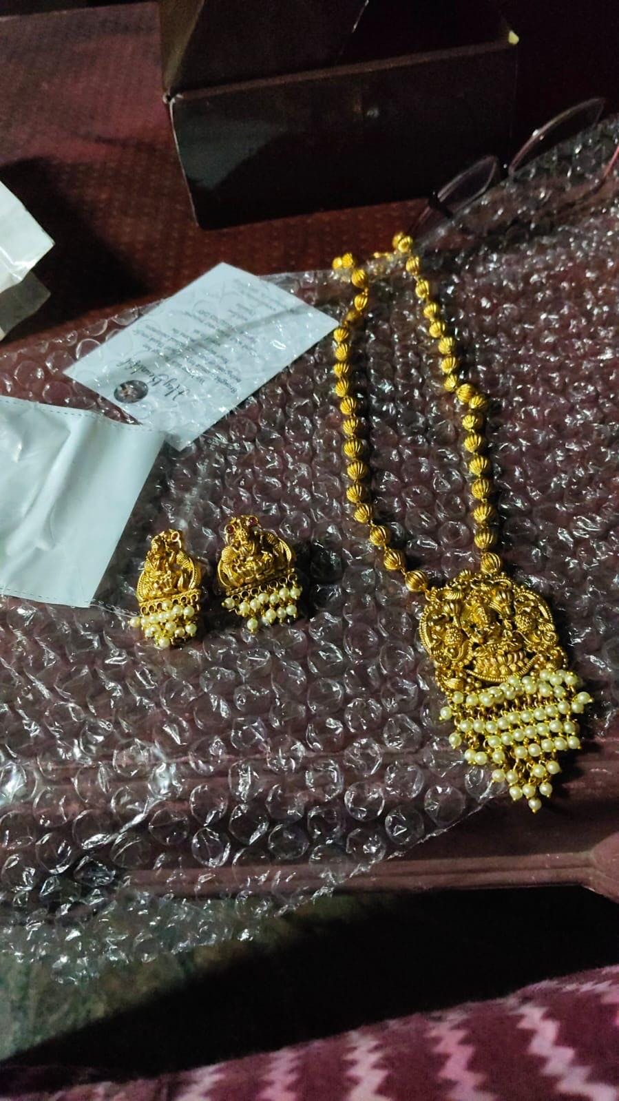 Temple-inspired Goddess Lakshmi pendant with intricate craftsmanship. Delicate pearl clusters at the base for added elegance. Antique gold bead chain that exudes a classic traditional vibe. Matching stud-style earrings with detailed Lakshmi motifs and pearl drops. Lightweight yet durable Design for comfort and long wear. Material Used: Premium-quality alloy with an antique gold-tone finish. Handcrafted with pearl embellishments and intricate carvings. Occasion : Perfect for weddings, religious ceremonies, festive celebrations, and traditional gatherings. Complements sarees, lehengas, and ethnic attire, making it an ideal choice for a royal and sophisticated look.
