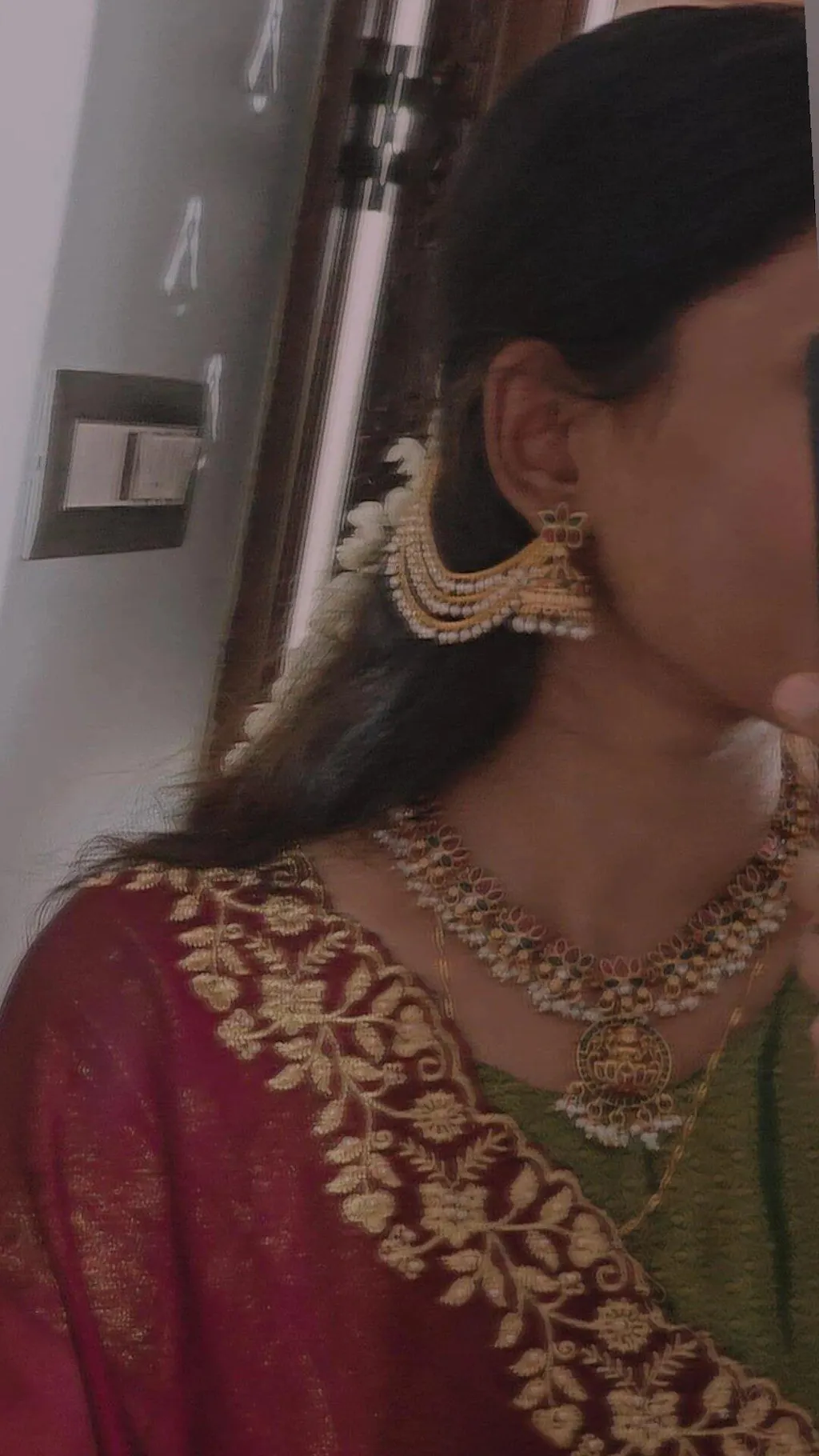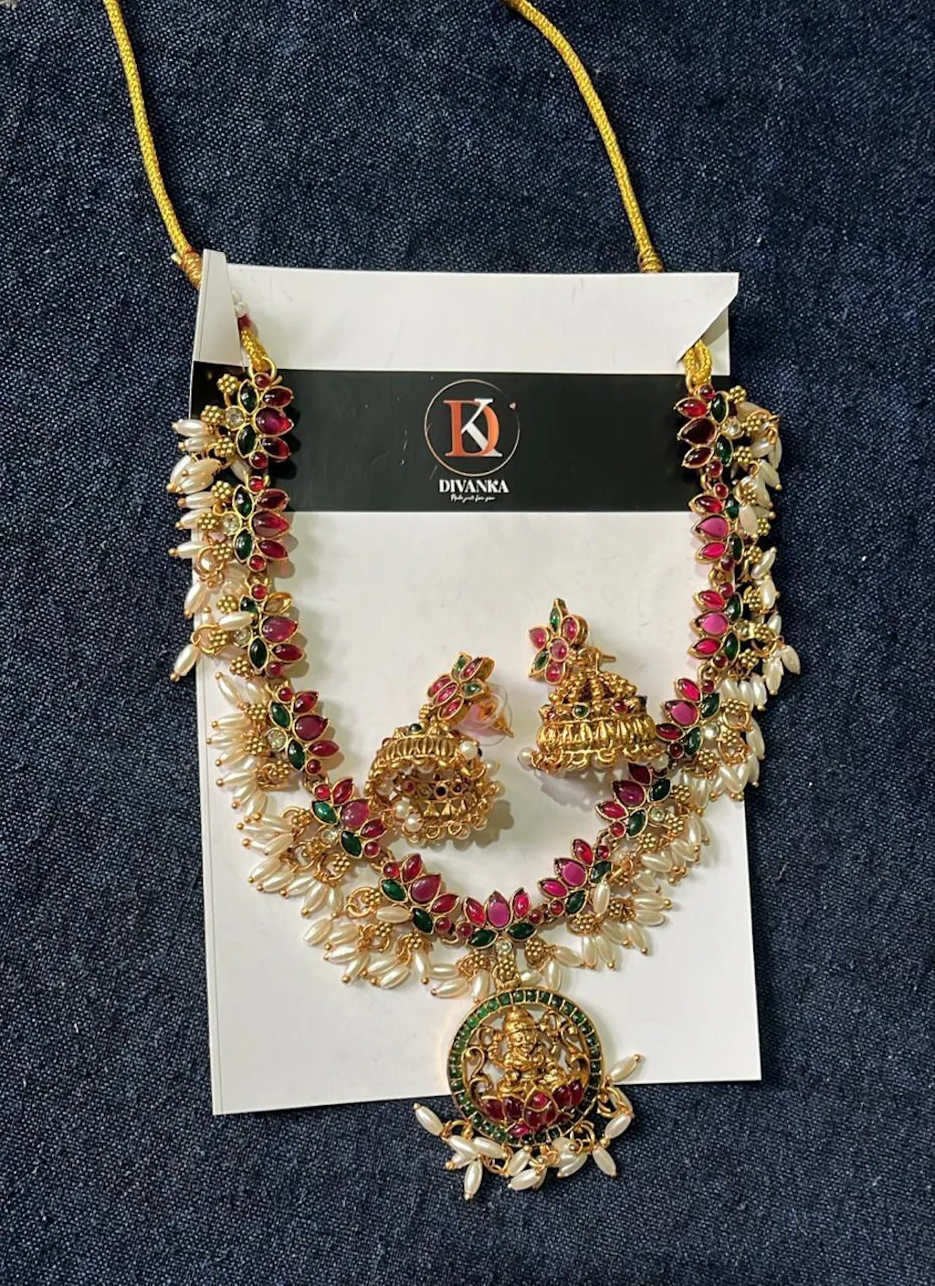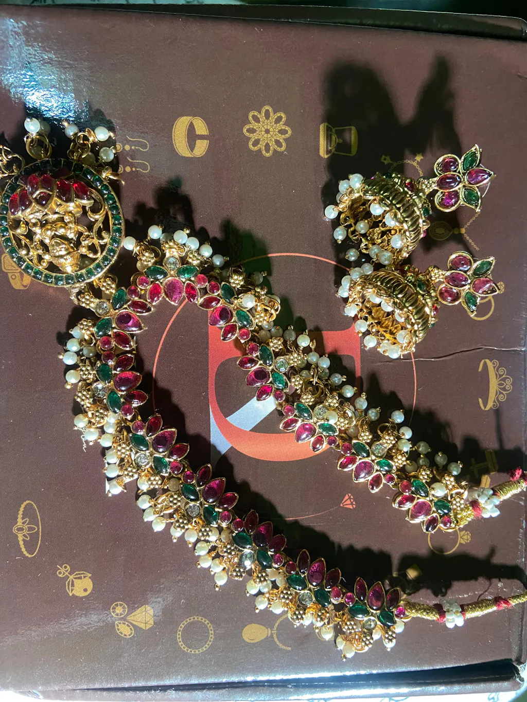 Adorn yourself with the divine grace of padma Lakshmi necklace Set. Featuring a detailed Lakshmi pendant surrounded by radiant red, green, and white floral stones, this set is designed to bless your festive look with tradition and elegance. Finished with pearl accents and a beautiful jhumka, it’s perfect for weddings, pujas, or any grand celebration.