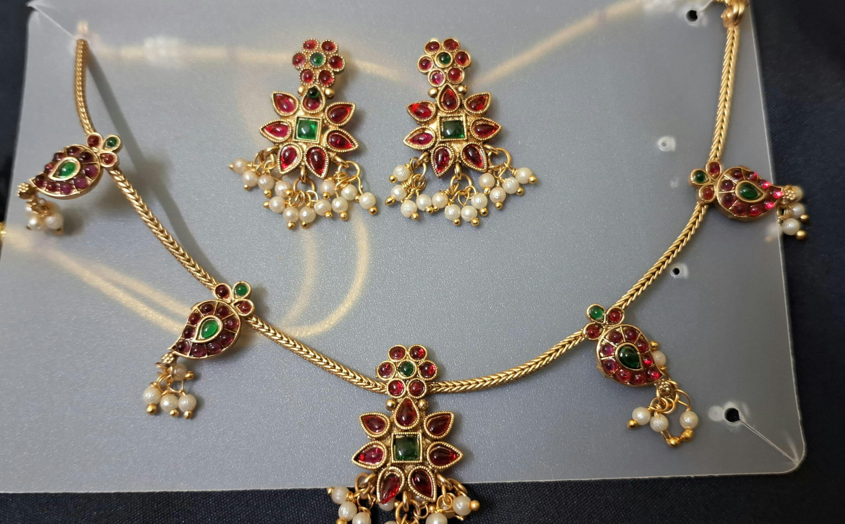 floral-inspired motifs with ruby-red and emerald-green kemp stones. Delicate pearl hangings for added charm and movement. Matching statement earrings with complementing Design. Luxurious antique gold-tone finish for a vintage appeal. Adjustable thread closure for the perfect fit. Material : High-quality alloy with kemp stones and pearl embellishments. Necklace Length: Adjustable thread closure