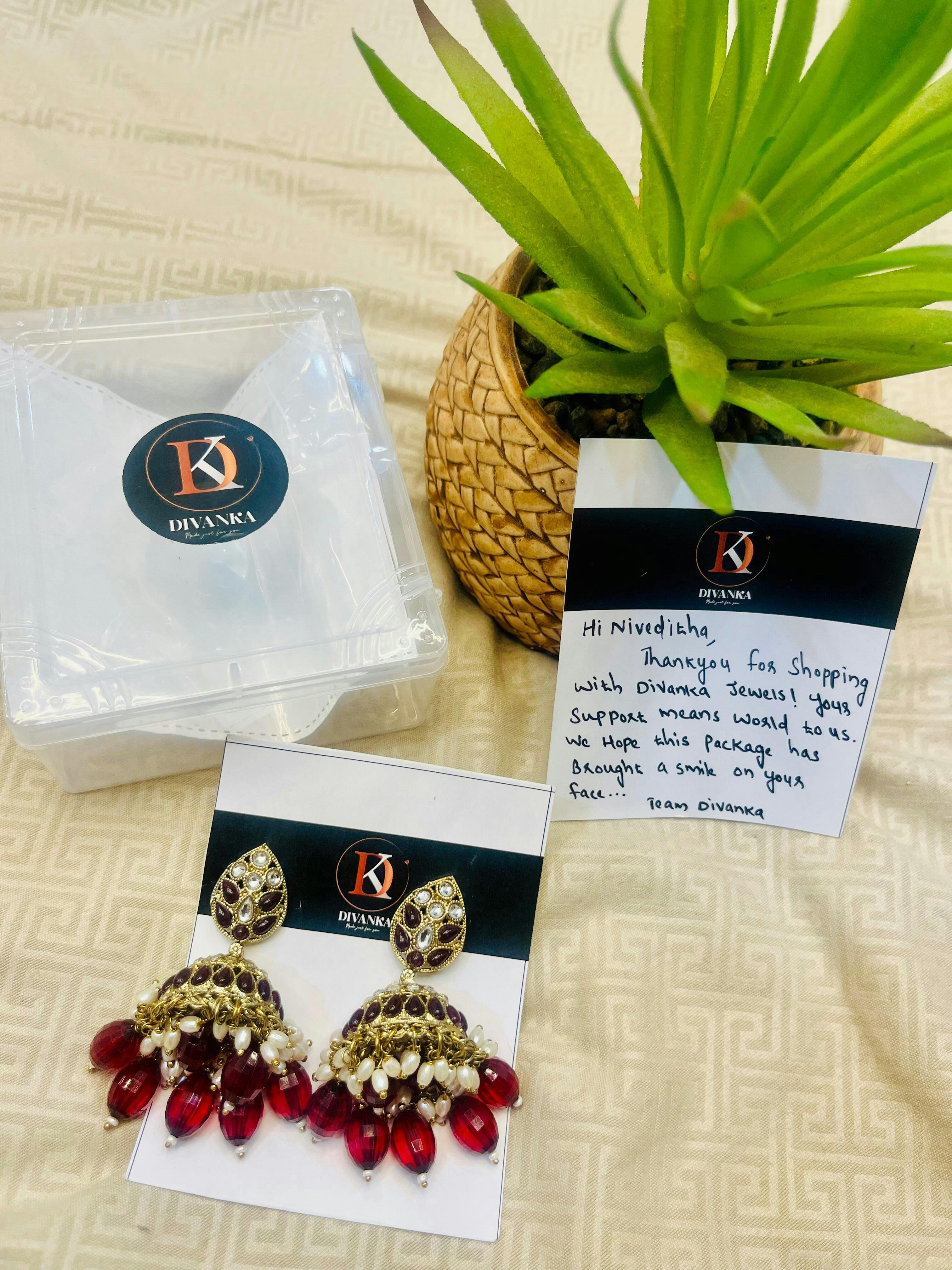 Design : Elevate your ethnic look with these regal jhumka earrings featuring a teardrop-shaped stud encrusted with ruby red and sparkling white stones. The intricate dome-shaped jhumka is adorned with ruby enamel detailing, delicate pearl clusters, and rich red glass beads, exuding timeless elegance and sophistication. Material : Crafted from high-quality alloy, accented with enamel work, faux pearls, glass beads, and premium stones. Style : These earrings beautifully blend traditional craftsmanship with opulent Design, making them a standout accessory for special occasions. Occasion : Perfect for weddings, festive celebrations, or formal events, these earrings add a touch of grandeur and charm to any ensemble. Add these stunning earrings to your collection and make a lasting impression at every event.