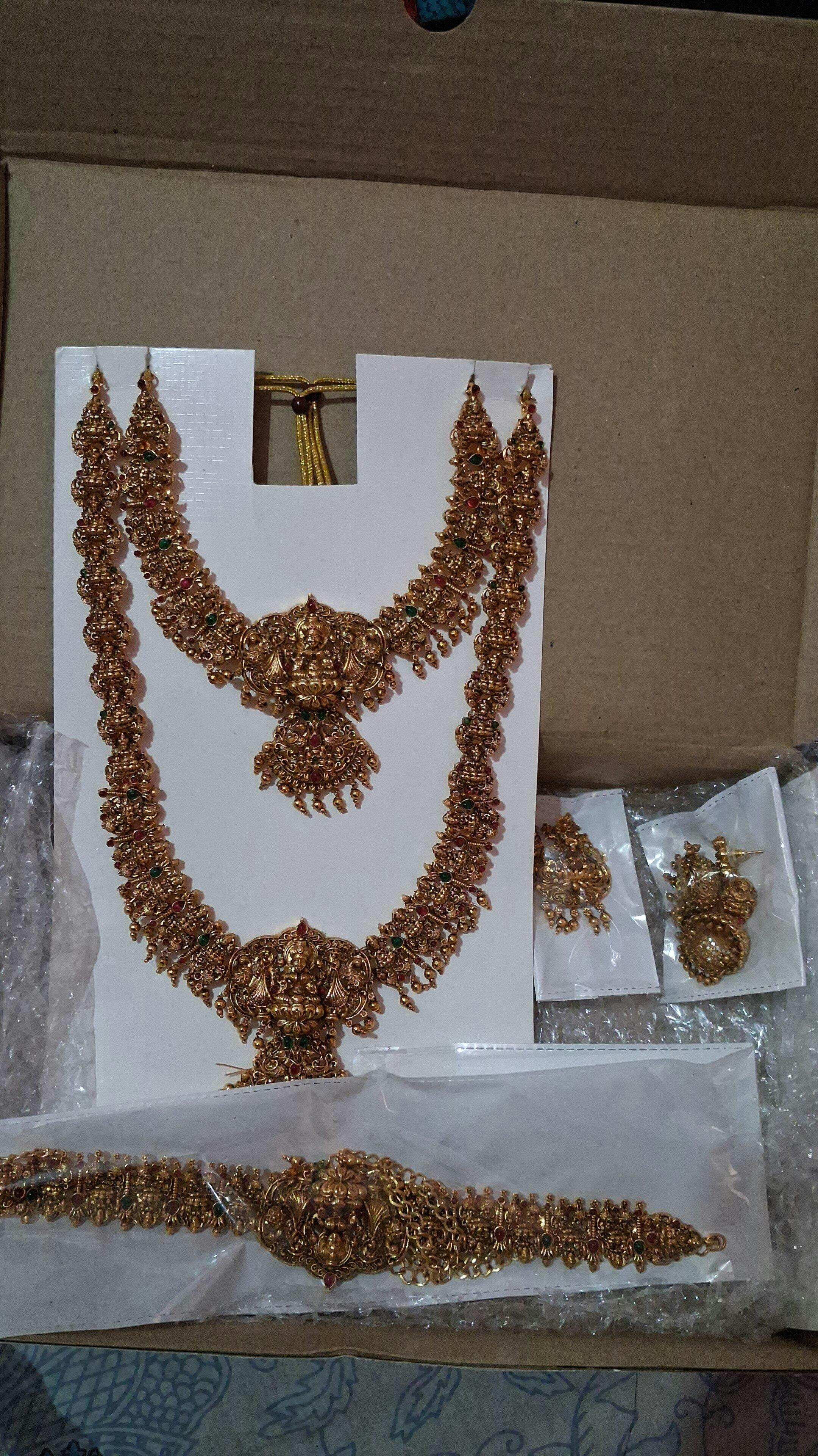 A majestic bridal ensemble rooted in temple tradition, this 5-piece bridal set includes a short necklace, long haram, hipbelt (oddiyanam), tikka, and a stunning pair of jhumka earrings. Crafted in antique gold tones, the set features divine motifs, dancing peacocks, and intricate floral detailing, enriched with hints of ruby red and emerald green stones.