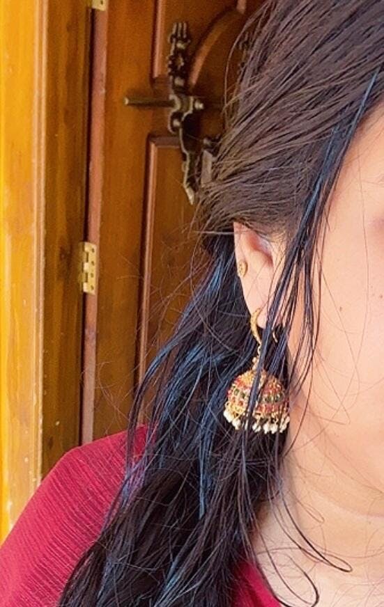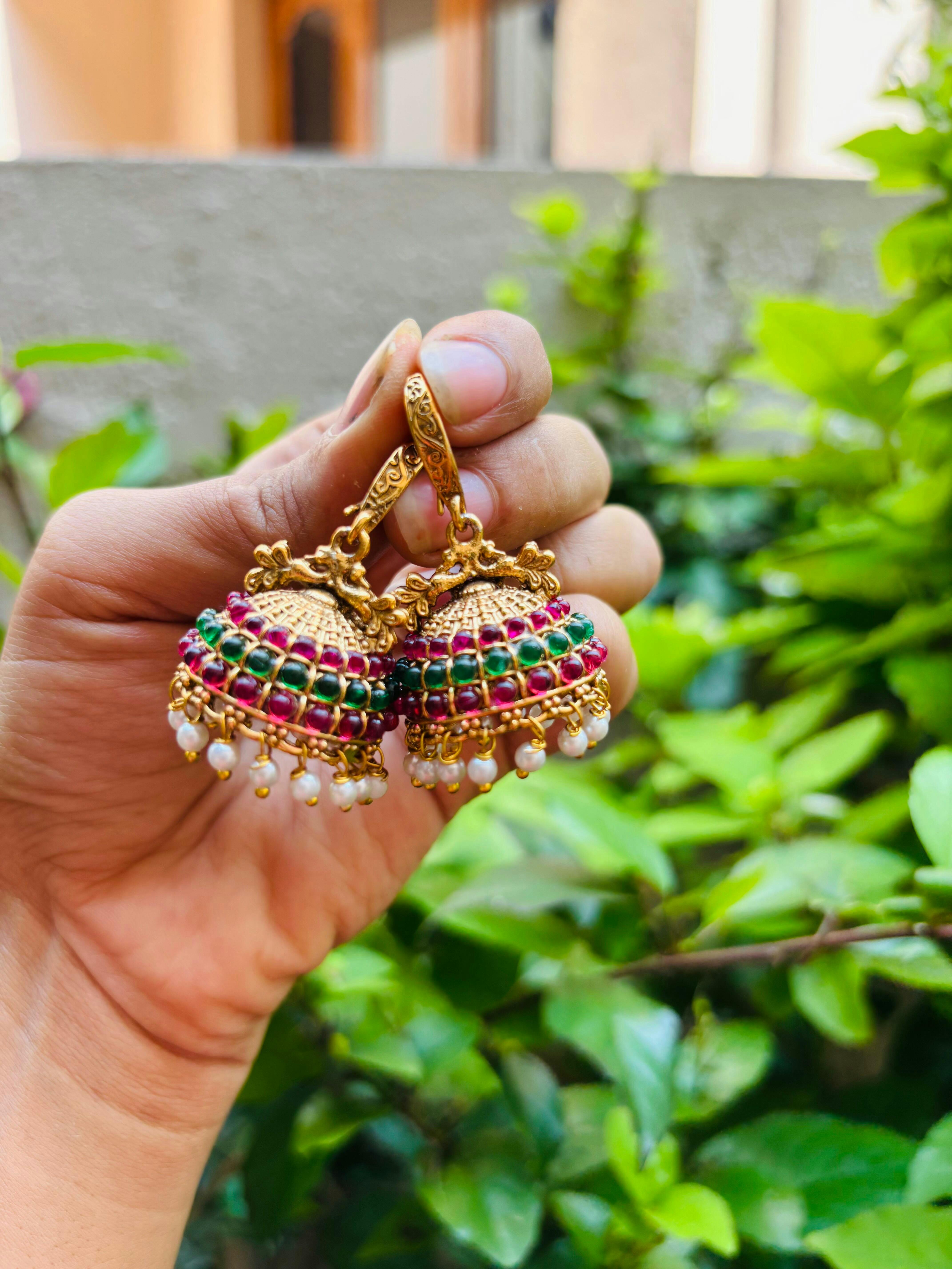 Bring timeless grace to your look with these traditional temple jhumkas, adorned with layers of ruby red and emerald green beads, finished with delicate pearl hangings. A classic pair that beautifully complements festive and bridal ensembles.