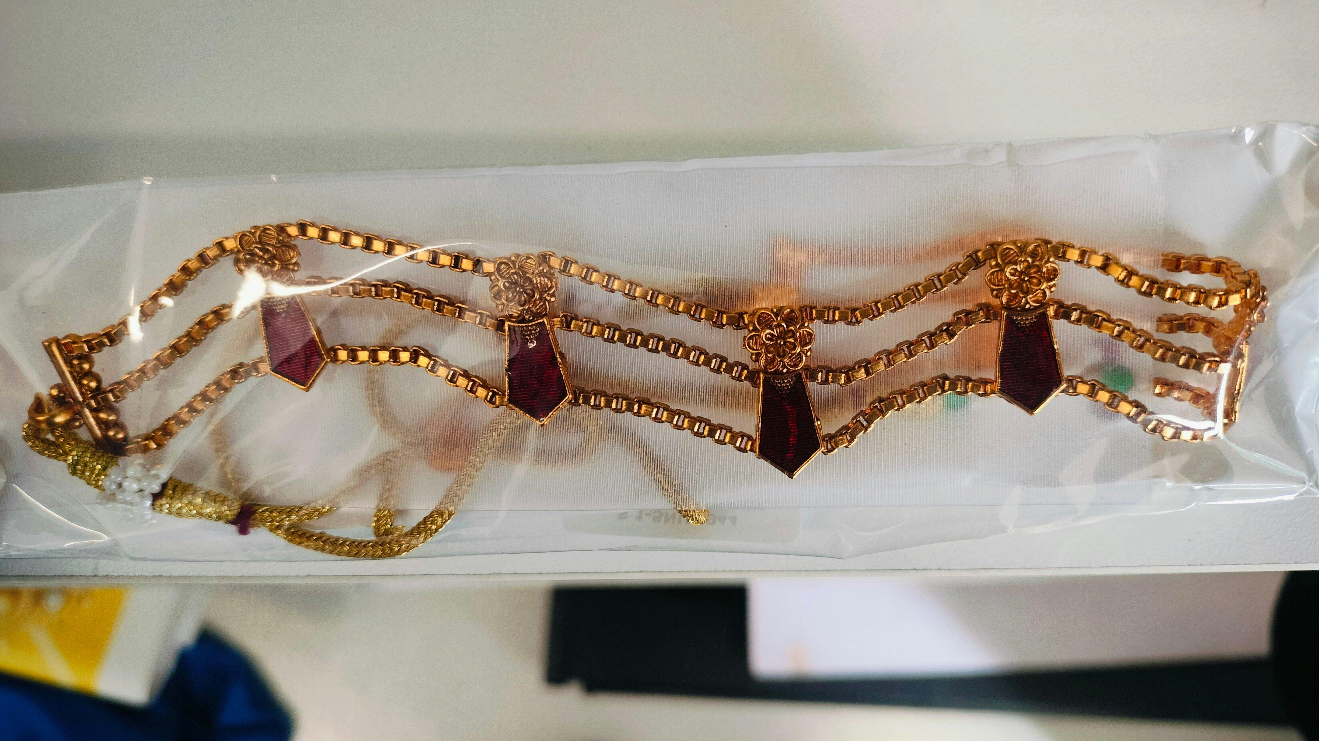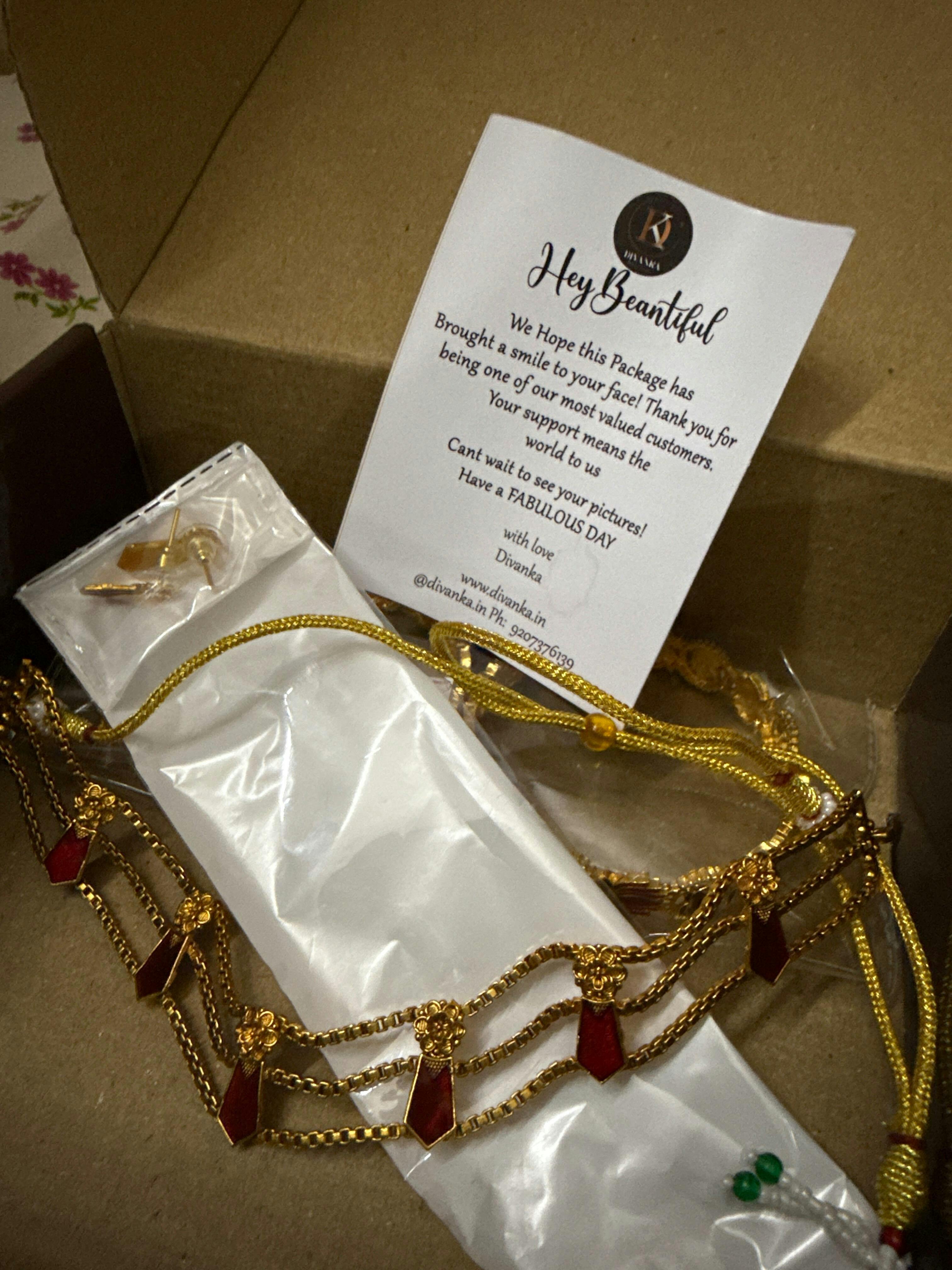A graceful blend of tradition and elegance, this three-layer choker features intricate floral motifs paired with vibrant gemstone accents in green or red. The matching stud earrings complete the look, making it perfect for festive wear, weddings, and cultural celebrations. The triple chain design adds a refined touch, while the floral detailing brings a hint of vintage charm. Versatile yet statement-making, it beautifully complements both sarees and ethnic ensembles.